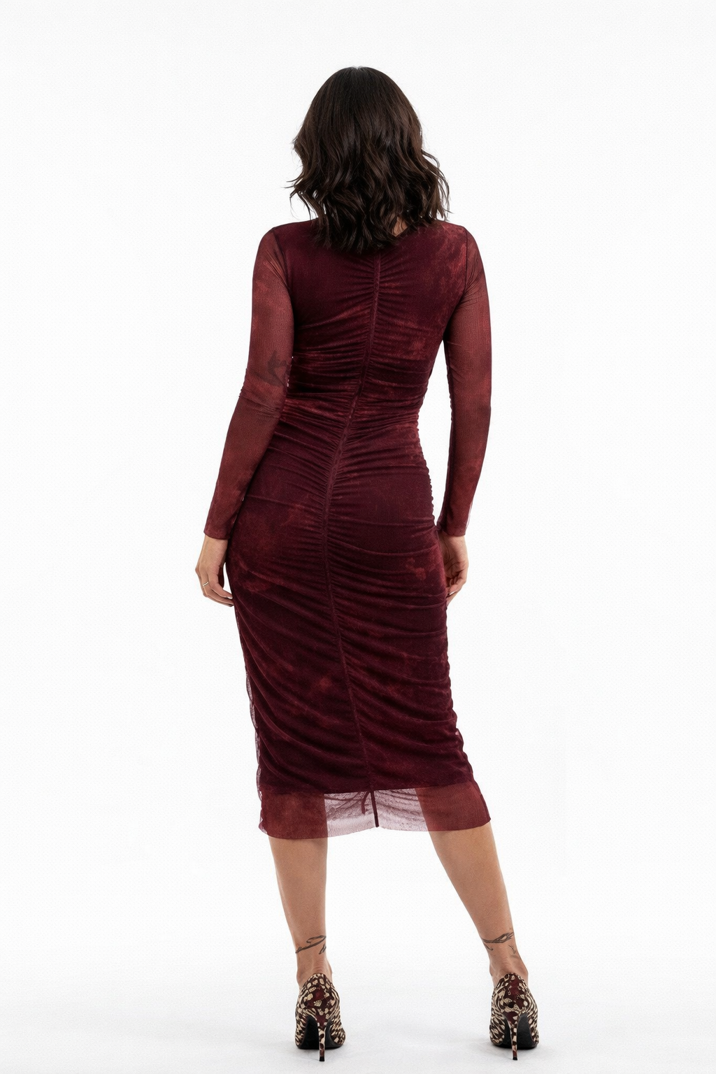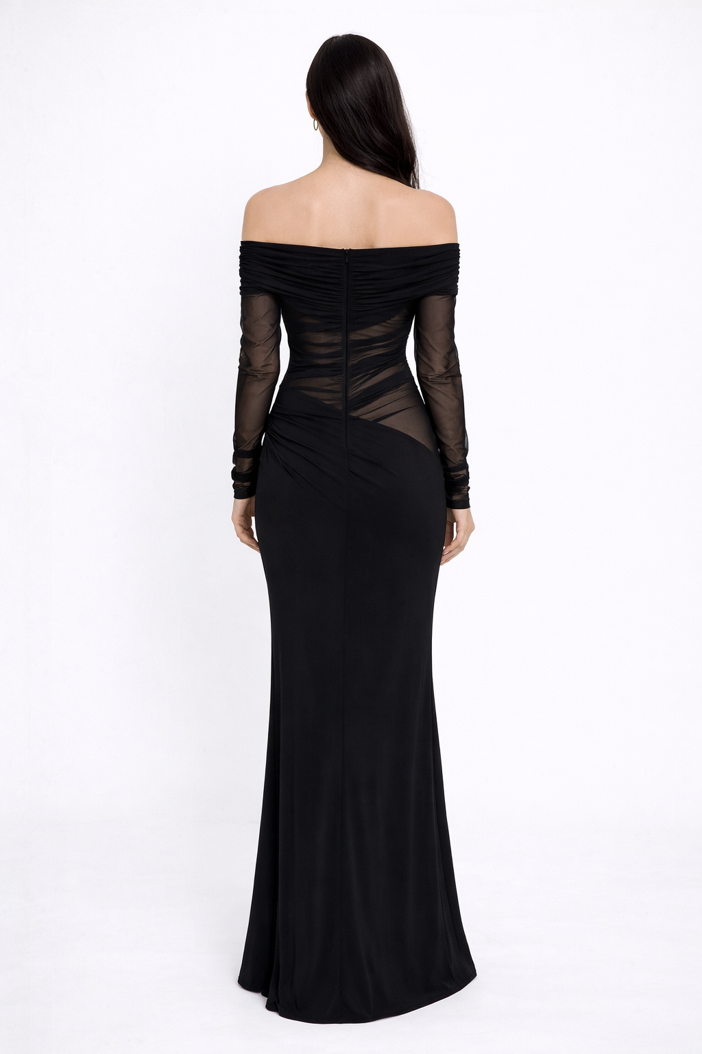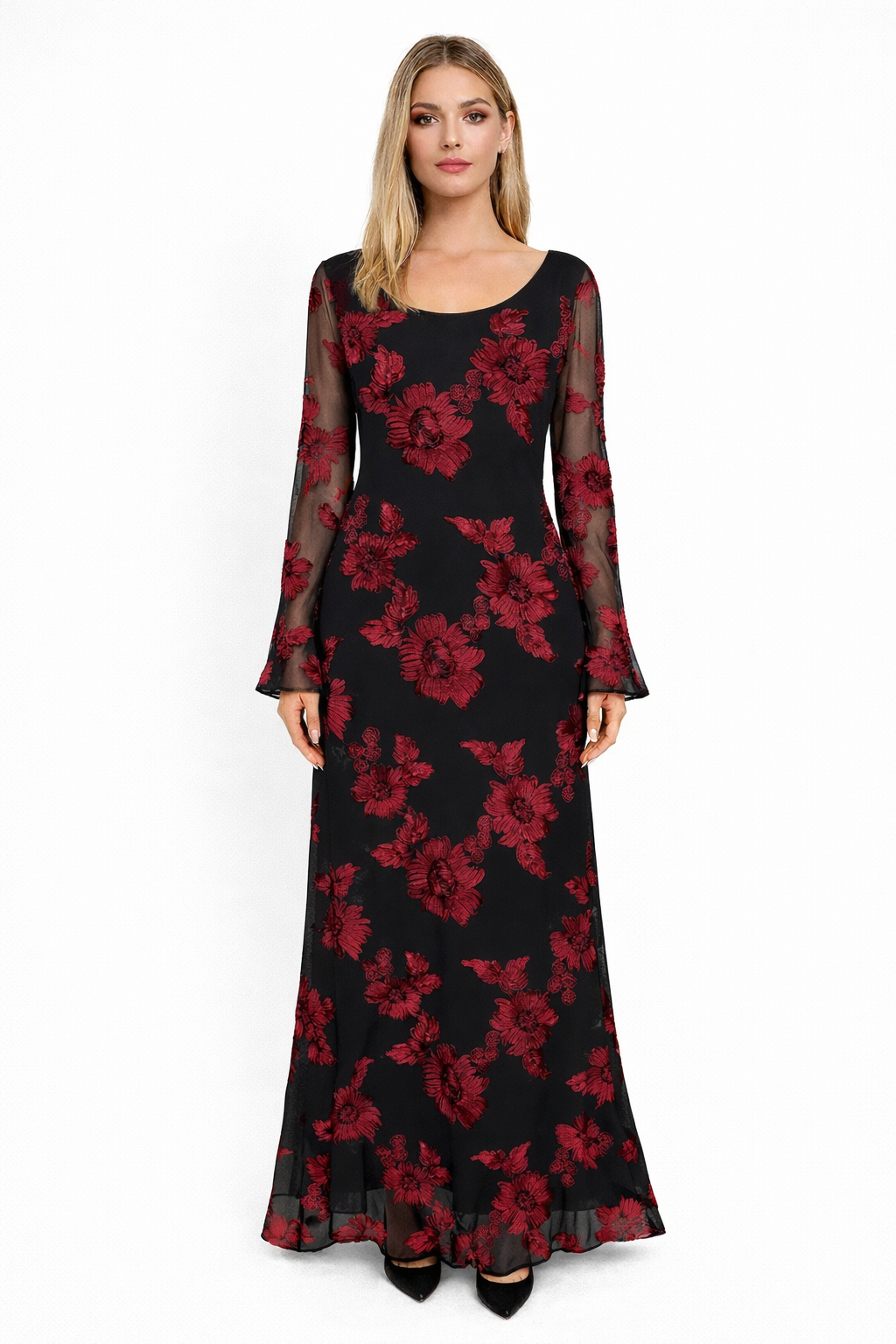 Abito Lungo Floreale Ricamato con Maniche Trasparenti