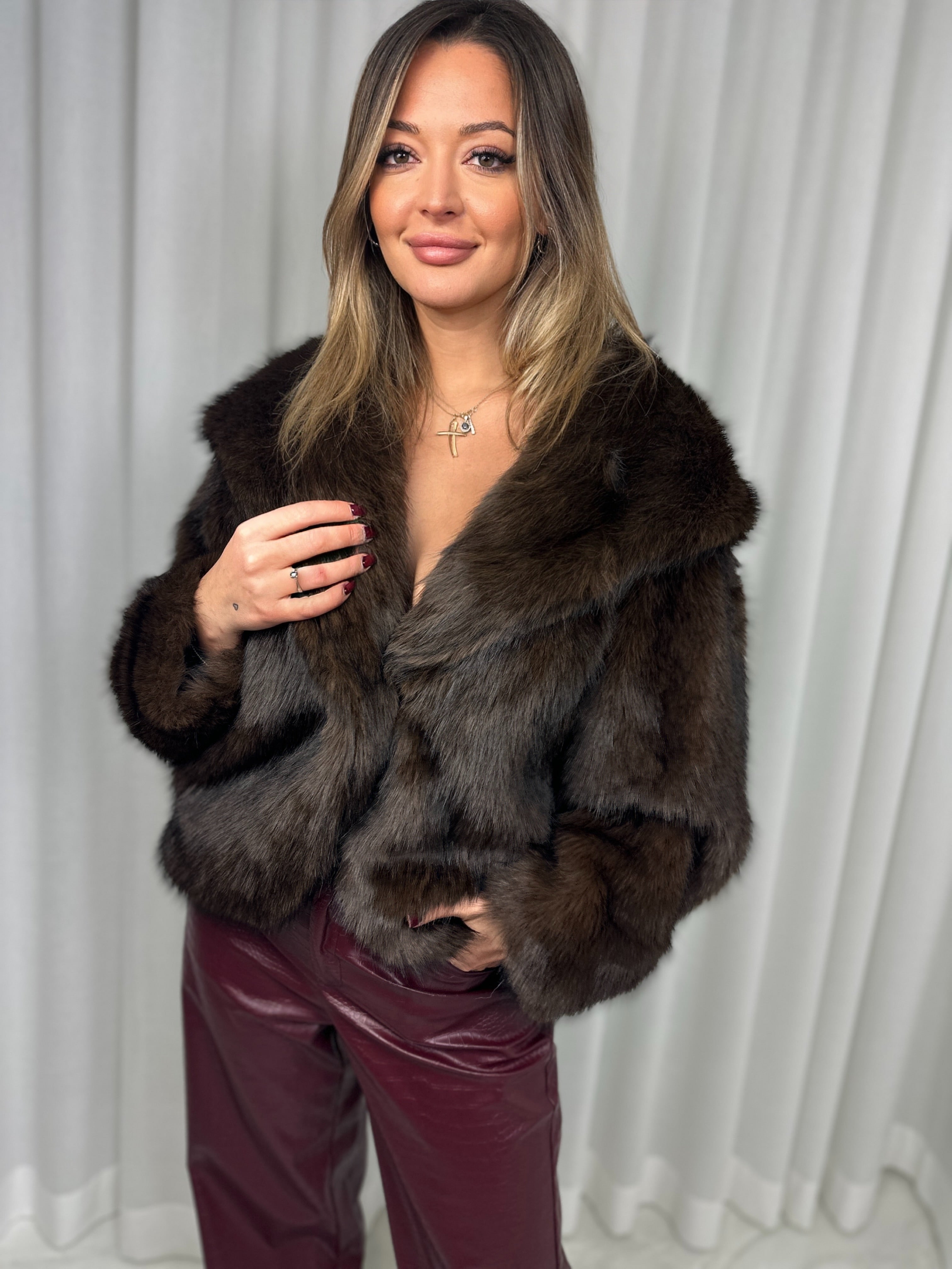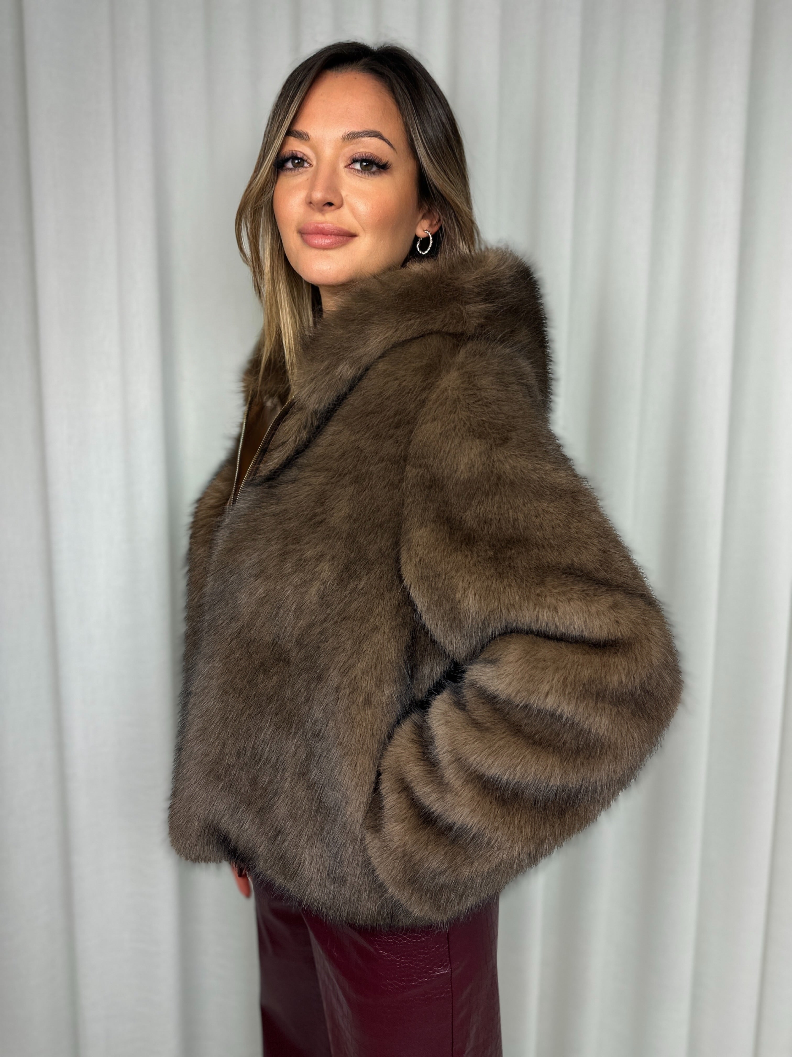 Giacca Vienna in ecopelliccia con dettagli in ecopelle – Caffè