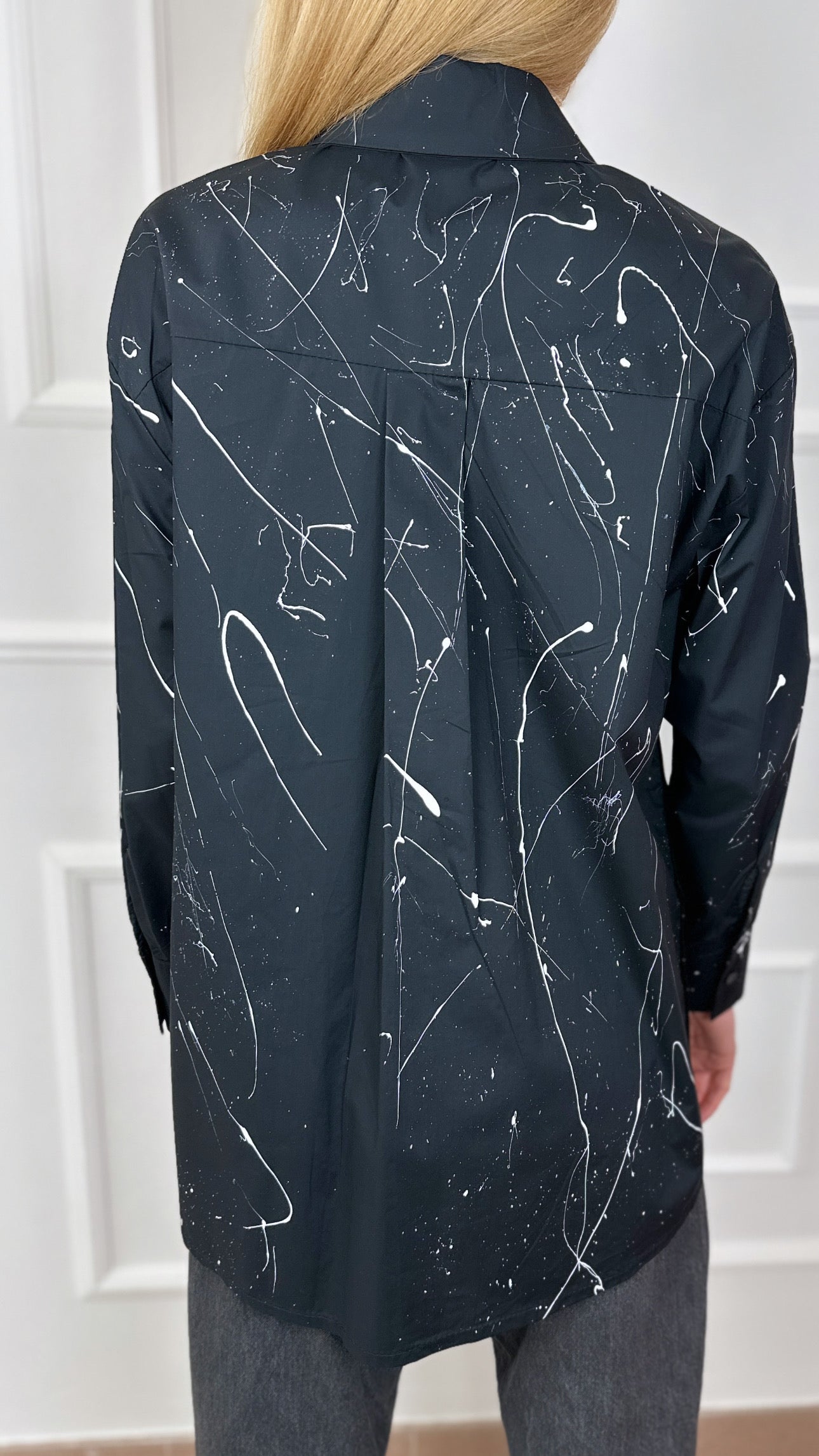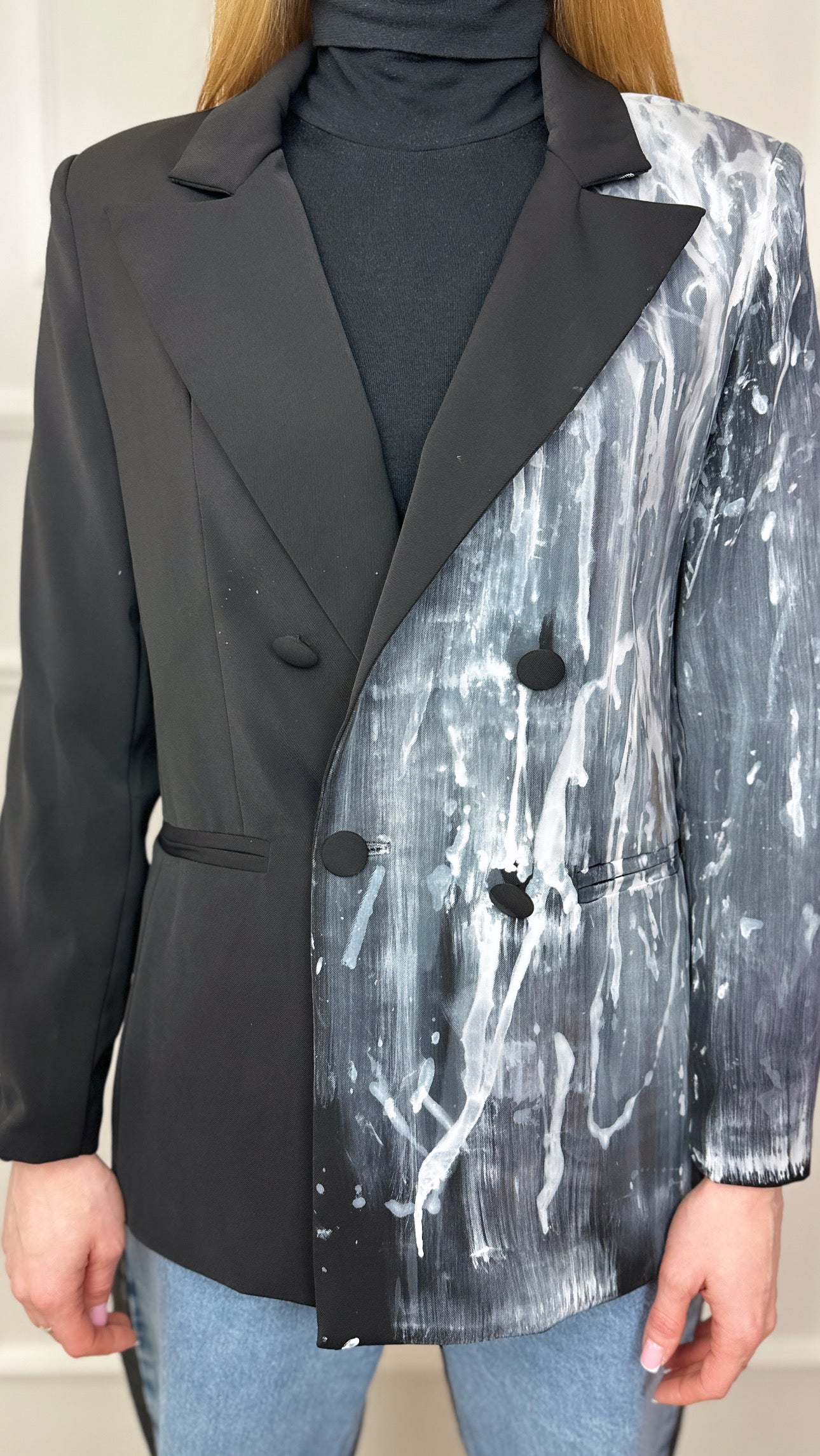 Il suo stile, audace e innovativo, mescola pittura a mano libera con elementi di design grafico, creando texture e contrasti che nessun altro avrebbe osato. Ogni giubbotto di YO è un pezzo unico, fatto a mano, che racconta una storia diversa. Immagini disturbanti di occhi che scrutavano, linee che si intrecciavano come cicatrici, motivi geometrici che sembravano rubati dalla mente di un architetto del futuro, ma anche fiori selvatici che sbocciavano in contrasto con il rigore di pelle e denim. Ogni dettaglio trasmetteva una tensione, come se il giubbotto stesso fosse in costante lotta tra la bellezza e il caos.